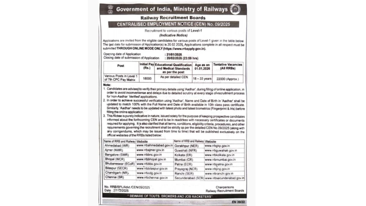 The recruitment is for 22,000 Level-1 posts across various departments like Engineering, Electrical, Mechanical, and S&T. Some of the key posts include: